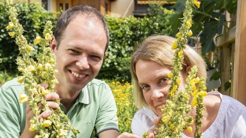 Auch unsere Honigbienen fühlen sich auf den blühenden Kräuterwiesen wohl und sammeln fleißig Nektar für unsere verschiedenen Honigsorten – ein wahrer Genuss, den wir mit großer Dankbarkeit ernten.