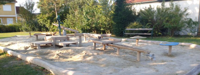 Der eingezäunte Spielplatz bietet abwechslungsreiche Spielmöglichkeiten für Kinder verschiedener Altersgruppen. Besonders beliebt sind der großzügige Sandspielbereich mit Wasserspielelementen, der kreatives und gemeinsames Spielen fördert, sowie Schaukeln, Kletter- und Balancierelemente und eine Rutsche. Natürlicher Schatten durch große Bäume und Sitzgelegenheiten sorgen für angenehme Aufenthaltsqualität und machen den Spielplatz zu einem idealen Ort für Familien.