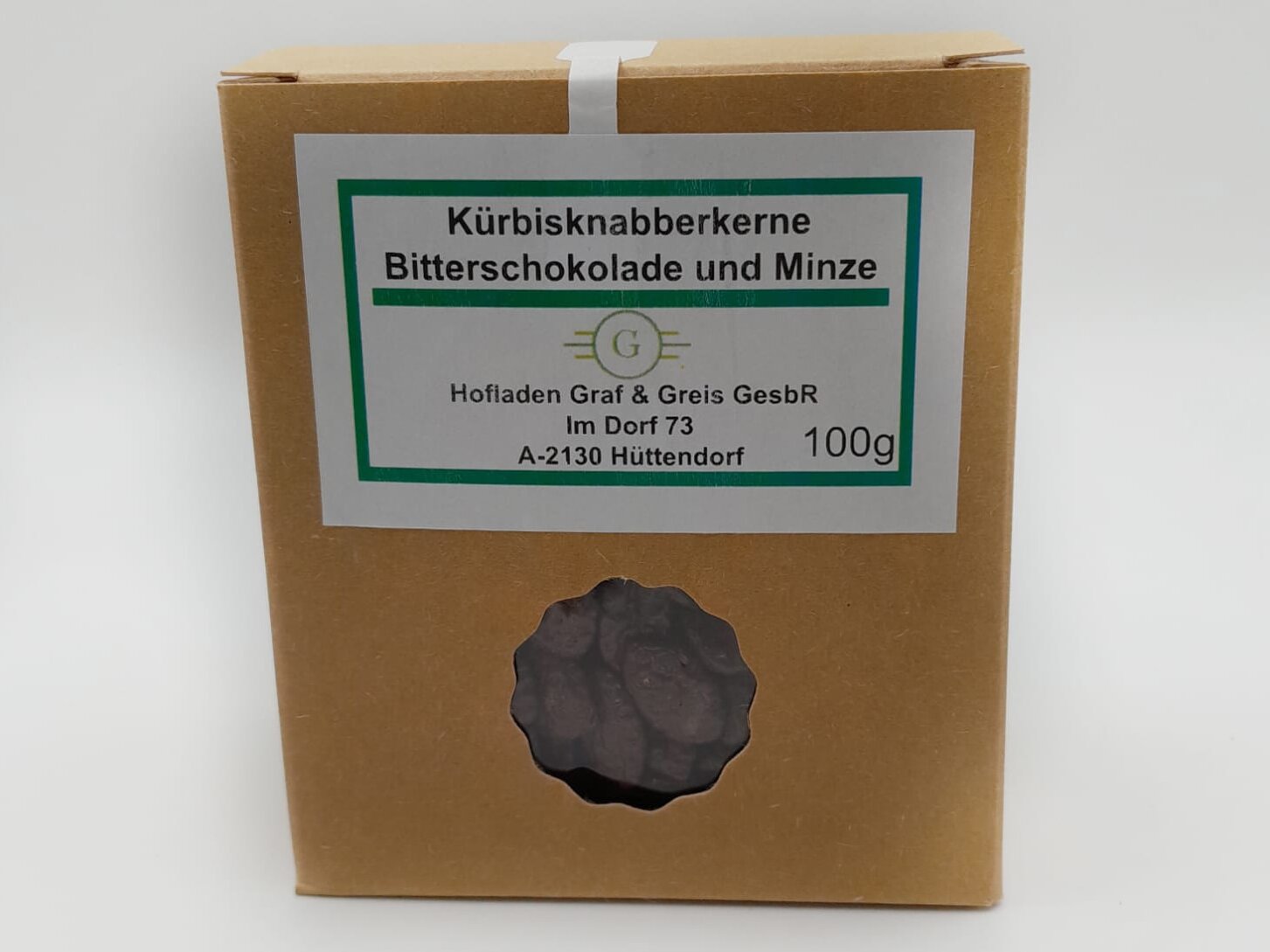 - Kürbiskernen mit Schoko-Himbeer oder Bitterschokolade mit Minze 100g