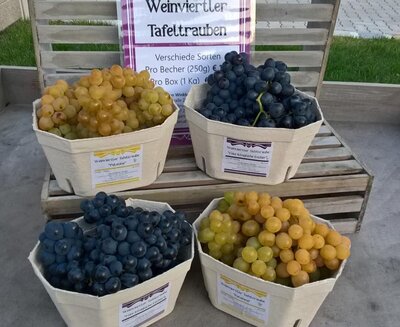 Weiße und rote Tafeltrauben, die wir Ende August - Anfang Oktober lesen - verschiedene Sorten, verschiedene Geschmäcker, aber immer frisch, sonnengereift und knackig. Ein Vitaminsnack, der aus dem Weinviertel nicht mehr wegzudenken ist. Abgepackt in 1 kg Obstschalen. Mehr Menge gerne auf Vorbestellung erhältich
