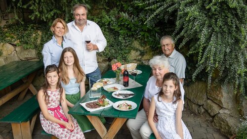 Natürlich wird auch der Wein selbst kultiviert und gekeltert, ebenso wie der Trauben-, Apfel-, Johannisbeer-, Holunderblütensaft und der Marillennektar.